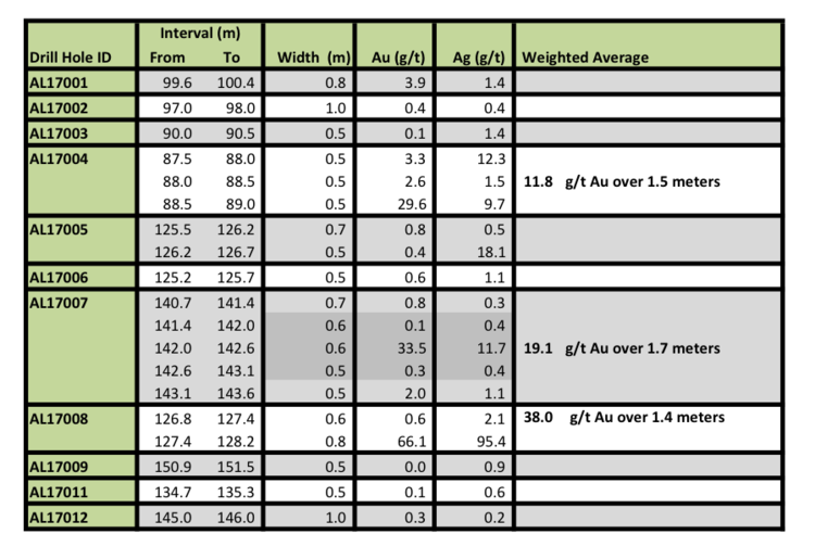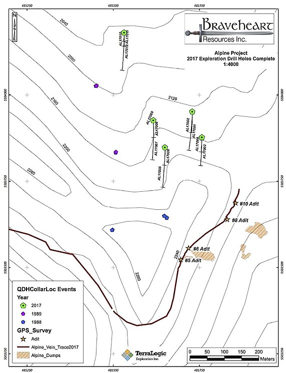 TORONTO, ONTARIO, (Newsfile Corp. – November 15, 2017) - Braveheart Resources Inc. (TSXV: BHT) ("Braveheart" or, the "Company") announces the final results from the recently completed 2017 diamond drilling program at the Alpine Mine property near Nelson, BC (Alpine) with more than 1,600 meters drilled in 11 holes. Braveheart had reported the results from 10 holes, the best assay coming from Hole AL17008 returning 33.6 g/t Au over 1.6m (including 66.1 g/t Au over 0.8m). Figure 1 in the Appendix shows the drill hole locations; Figure 2 is a typical cross section of several of the drill holes intersecting the mineralized vein structure.