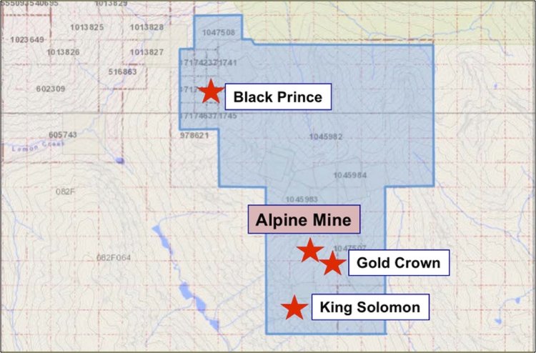 The Black Prince is located approximately 3.1 km to the northwest of the main Alpine Mine area. Selected sampling of quartz veins in old mine dumps at the Black Prince returned up to 71.0 g/t gold and 34 g/t silver. At the King Solomon, quartz vein samples from old mine dumps returned up to 50.0 g/t gold and 42.2 g/t silver. The old King Solomon workings are located approximately 1.8 km to the south-southwest of the Alpine mine. At the old Gold Crown workings selected samples of partially oxidized sulphide-bearing quartz vein material from mine dumps returned 267 g/t gold and 47.6 g/t silver. The Gold Crown is located approximately 620 m to the southeast of the Alpine Mine area.