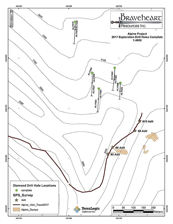 Phil Keele, Braveheart President and CEO stated, “The objective of the program was to improve our understanding of the gold potential on the down dip side of the vein structure at Alpine. While much of the lab work on core samples is still pending, I can confirm that quartz vein material was intersected in 10 of the 11 holes. Historical information has shown that mineralization typically occurs in and around the main quartz vein structure at Alpine. I am also pleased to announce that lab results have been received for five drill holes where mineralized material was intersected. These results can be seen in Table 1 below. Further analyses will be released as the information becomes available but we are excited by these results so far. Our thanks go out to our contractors, Lucky Drilling Ltd, supported by the services of TerraLogic Exploration Inc. and Masse Environmental Consultants Ltd. who were able to complete the diamond drilling program lost-time and accident free and under budget. A job well done.”